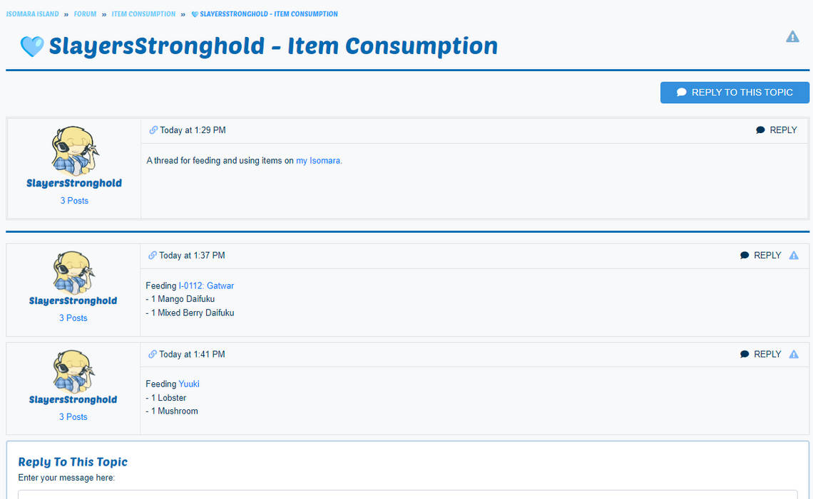 - A new forum sub-topic has been made specifically for item consumption. Please refrain from submitting claims to feed your Isomara; instead, make a new thread with your username as the title. This thread will be for you to use for all your characters.