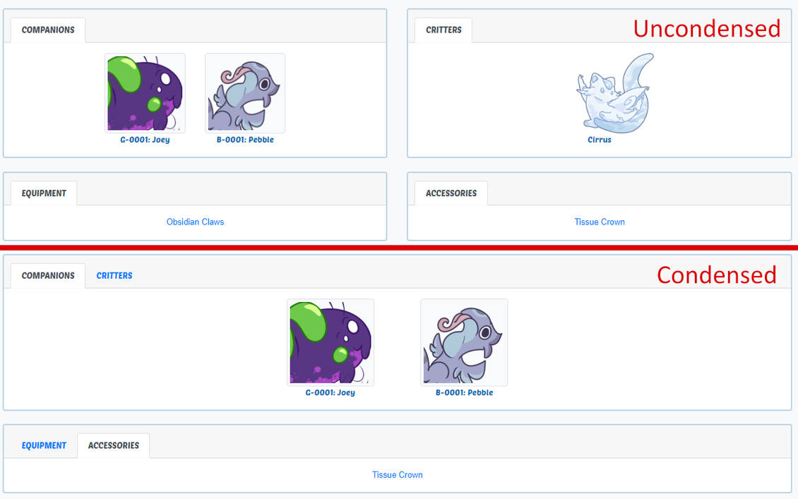 - Separation of content boxes - Based on some opinions and preferences on the Isomara Island Discord, we've updated the character pages so that the content boxes containing companions/critters and equipment/accessories can now be condensed as they were or separated.