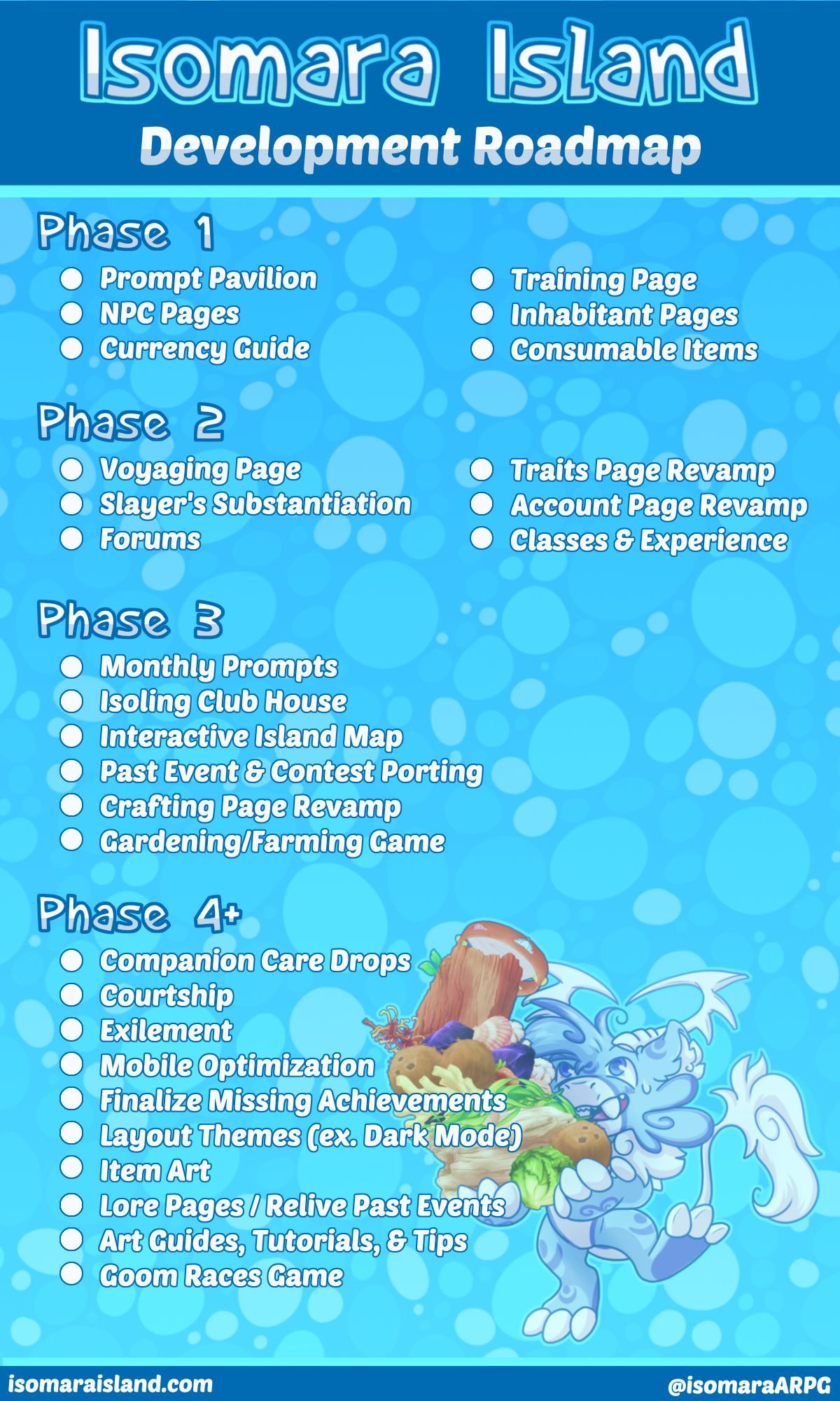 During phase 1, we will finish porting base pages and implementing the core features of the Isomara Island ARPG.